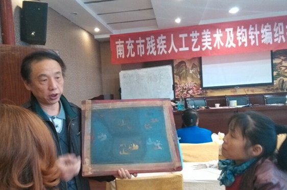 为引导和推动残疾人就业创业,提高残疾人的职业技能水平,近日,市残联在金泉大酒店举行了为期5天的工艺美术及钩针编织技术培训班,来自各县(市、区)的47名残疾人学员参加了培训。 在开班仪式上,市残联党组成员、纪检组长尹晓辉同志作了重要讲话,她希望每一位学员发扬自强不息、努力奋斗的精神,认真学习技能,变“输血”为“造血”,用勤劳的双手切实改变生活状况,走上脱贫致富之路。 在培训班上,四川工艺美术大师高作庆老师向大家讲解了工艺美术在生活中的重要性及丝绸镜擦的制作方法。学员们表现出了浓厚的兴趣,在老师指导下,一幅幅印有熊猫图案的镜擦很快在大家手里诞生了。“首先把毛线在钩针上绕两圈,把钩针插入左侧的辫孔……”在钩针编织课上,老师根据自己从事钩针编织多年的经验,深入浅出地向学员传授针法要领,大家都听得聚精会神,注意着老师手里的每一个动作,通过几天认真努力的学习,学员们都能独立钩织出各种颜色的漂亮作品。这些作品学员们可以自己售卖,也可以在市残联的电商平台上销售。