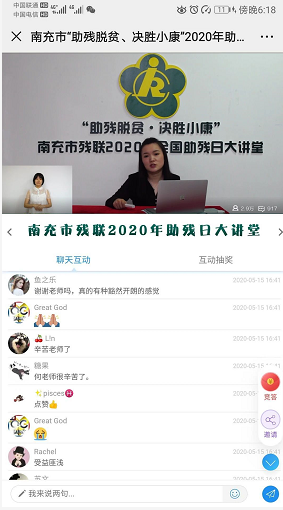 2020年是坚决打赢脱贫攻坚战的决战决胜之年,是全面建成小康社会和“十三五”规划的收官之年,也是落实市第六次残代会精神的开局之年。5月15日下午,为号召广大残疾人在脱贫奔康路上坚定信心、自强不息,大力弘扬扶残助残社会氛围,南充市残联聚焦“助残脱贫.决胜小康”主题,开展第三十次全国助残日线上网络直播活动。