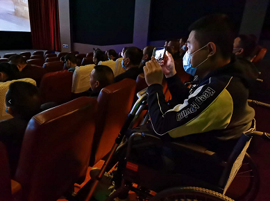 在陈列馆里,组织残疾朋友们观看了电影《邓小平的一生》