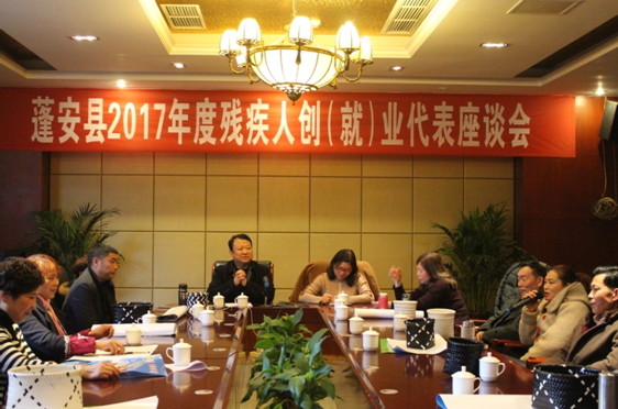 近日,蓬安县召开残疾人创(就)业座谈会。母红梅等17名残疾人创(就)业代表、各专门协会主席和助残公益机构负责人参加座谈会。会议由蓬安县残联党组成员、副理事长聂翠萍主持,蓬安县残联党组书记、理事长陈爱民出席座谈会并作重要讲话。