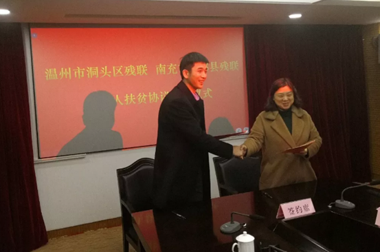 为了全面落实川浙残联系统东西部扶贫协作成都会议精神,推动川浙残联系统东西部扶贫协作工作深入开展,助推南部县残疾人脱贫攻坚工作落地。近日,在温州市洞头区政府第一会议室,洞头区残联党组书记、理事长叶生杰同志与南部县残联党组书记、理事长刘静同志在洞头区林伟宏常委副区长和南充市李会全理事长的见证下,签订了《温州市洞头区残疾人联合会南充市南部县残疾人联合会残疾人扶贫协作协议》。