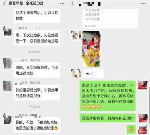 区残联党组书记、理事长唐玲通过电话、微信多次强调:线上康复要实现网络康复互动,开展形式多样的网络视频课程,特别是将公开课做成视频课程,家长可以反复观看视频。定点康复机构要最大限度的为残疾儿童提供居家康复方案,要定时接收线上咨询,及时回复家长提出的问题,做到停课不停训练。