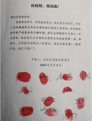 新冠肺炎疫情牵动着每一个人的心。面对疫情严峻形势,顺庆区残联党员干部纷纷请战,“抗击疫情,守土有责,我不想做一个旁观者。”2020年2月9日,在区委的统一安排部署下,残联机关11名党员干部主动请缨到疫情防控第一线,组成党员服务队,深入荆溪街道配合街道、社区工作人员做好辖区内疫情防控工作。