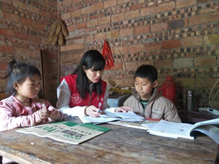随后,志愿者们来到胡小华家里。胡小华的妻子是多重残疾、聋哑人,育有2个孩子,除了务农再无其他经济来源,生计难以维持。在政府的大力帮助下,胡小华先生一家发展黄牛养殖,大大提高了家庭的整体收入。志愿者为其孩子辅导作业。每个志愿者都以自己微薄的力量奉献自己的爱心。