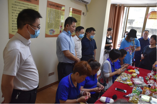 在王家嘴残疾人钩针编织基地,考察组一行详细了解编织基地的发展状况、观摩了手工艺品编织过程。该基地是集残疾人手工艺品制作、销售为一体的示范基地,通过聘请专业人士进行技能提升培训,让残疾人熟练掌握编织技能,现在可编织造型卡通、童趣时尚婴儿鞋帽、十二生肖、哼哈二将、马到成功、小挂件等各类手工编织艺术品。