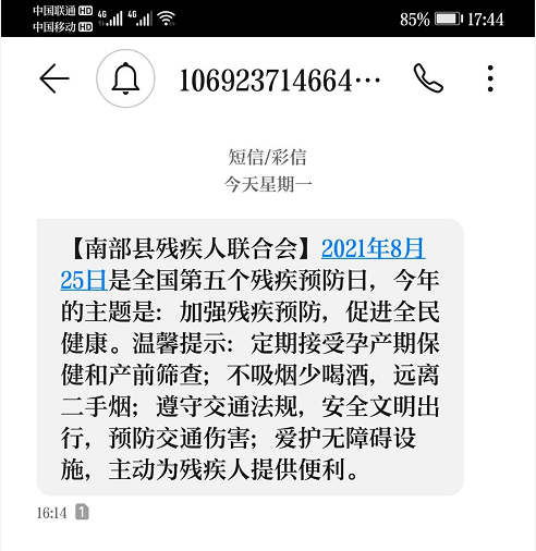 网络宣传:8月10日开始,利用云上南部、南部传媒等网络媒体、南部残联微信公众号推送残疾预防相关知识。