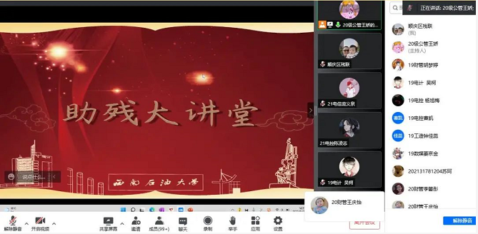 为广泛动员社会力量关爱残疾人、关注残疾人事业,在第三十二次“全国助残日”当天,顺庆区残联为西南石油大学西柚阳光助残服务队的同学们讲了一堂别开生面的“助残大讲堂”线上活动课,校内200余名学生参与了本次讲座。