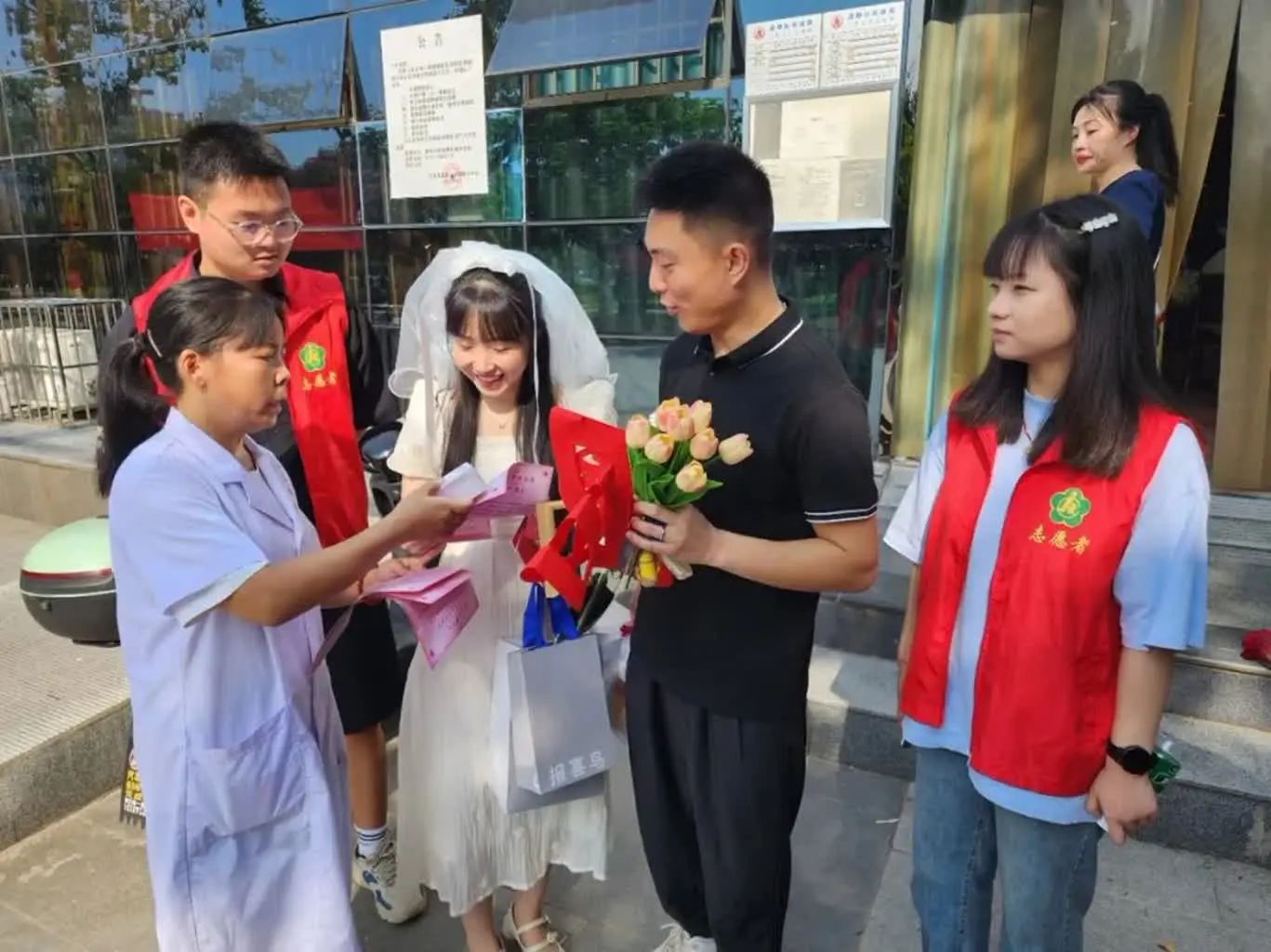 22日正值“七夕”,是全年的婚姻登记高峰日。在嘉陵区民政局婚姻登记中心门口,志愿者向前来进行结婚登记的新婚夫妇发放了《残疾预防核心知识》,向他们普及了“出生缺陷和发育障碍致残防控”等相关知识,鼓励新婚夫妇积极接受婚前医学检查和健康婚育指导,并告知她们孕早期饮食均衡营养的重要性。